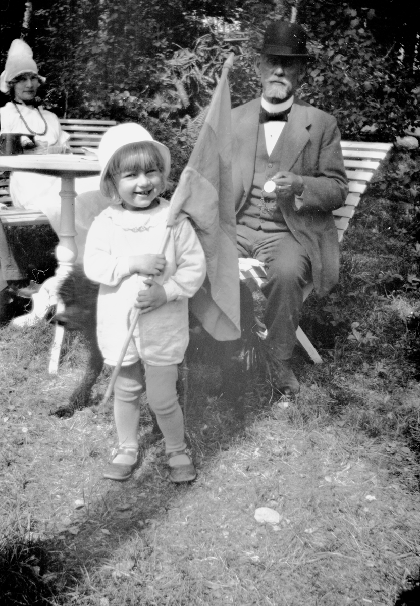 Bengt "Putte" Bauer står med en flagga i handen. Bakom honom sitter en kvinna och en äldre man, troligen Joseph Bauer, i trädgården vid Björkudden.