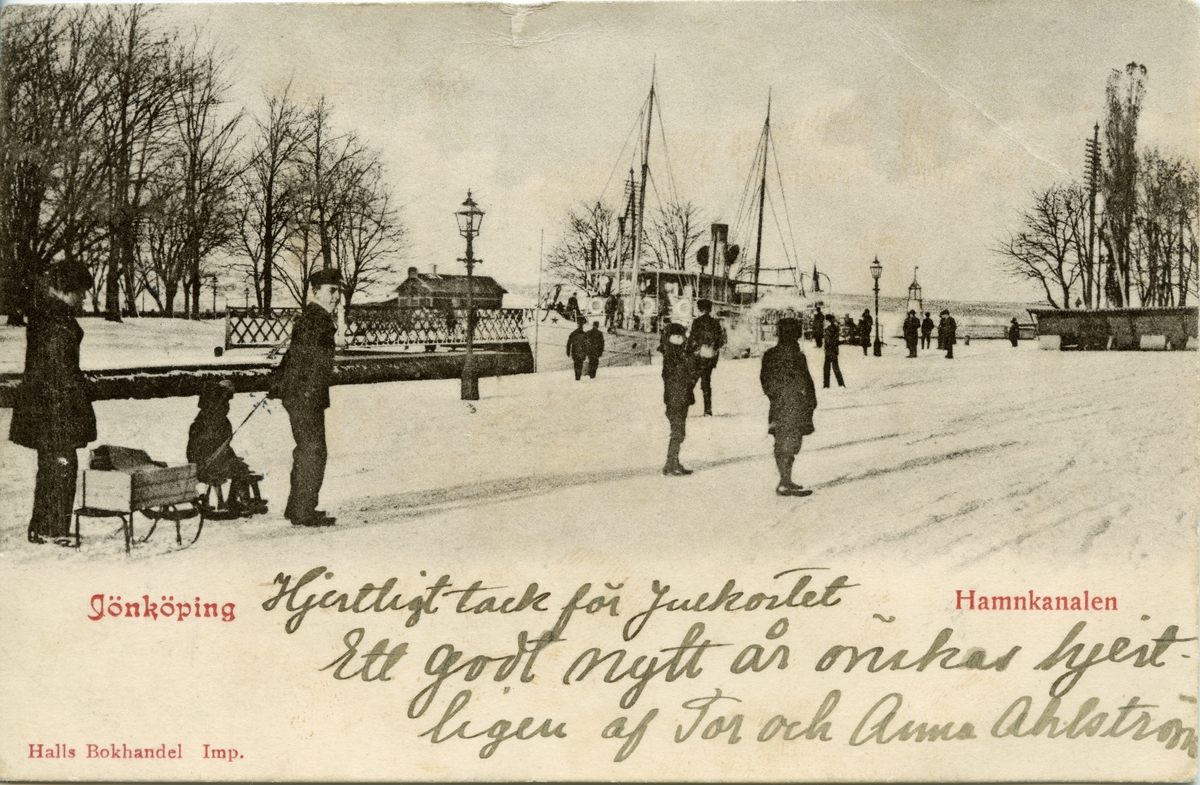 Ett Brefkort med motiv från hamnkanalen i Jönköping skickat till Stockholm 190?-12-30. Ett fartyg är på väg in genom kanalen mot Munksjön.