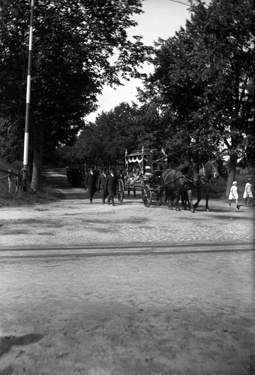 Begravningsfölje, troligen på Rosenbergsgatan i Jönköping mot Östra Kapellet. Rälsen i förgrunden tillhör Gripenbergsbanan. Hästar drar vagnen med den blomsterprydda kistan och efter den går begravningsgästerna.