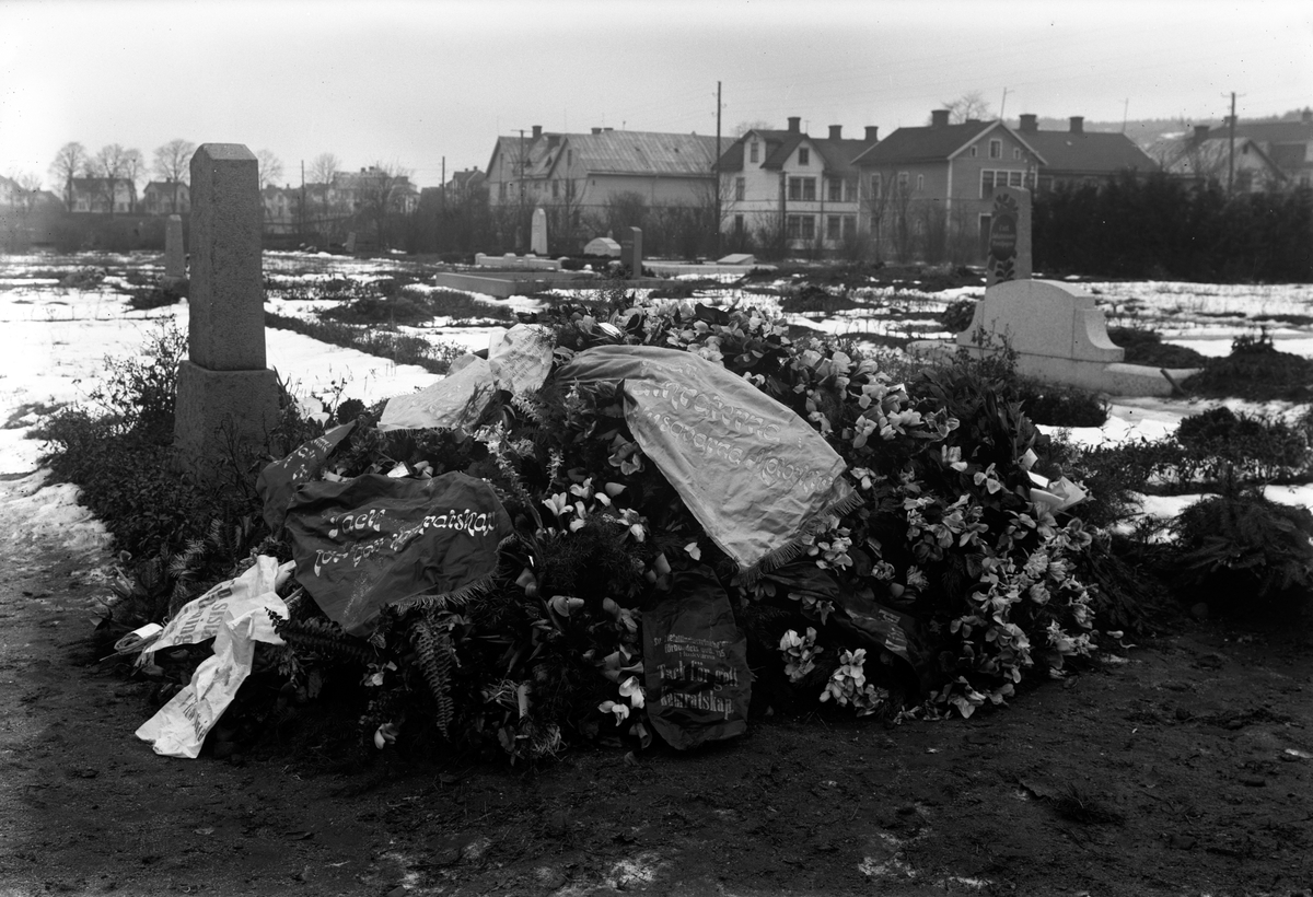En ny grav på kyrkogården i Huskvarna. Ovanpå ligger de sörjandes blommor med en sista hälsning skriven på banden, bland annan från Sv Metallarbetareförbundets avd 115 i Huskvarna.