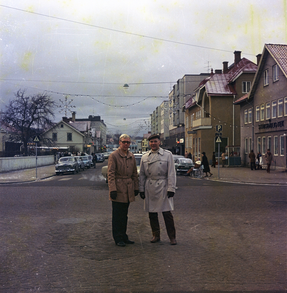 Lars och Lennart Tivelius står i korsningen Drottninggatan-Rosenborgsgatan i Huskvarna. Det är vinter och över Rosenborgsgatan hänger julstjärnorna uppe.