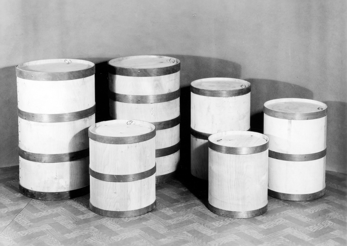 Plywoodtunnor med lock från Habo Laggkärlsfabrik.