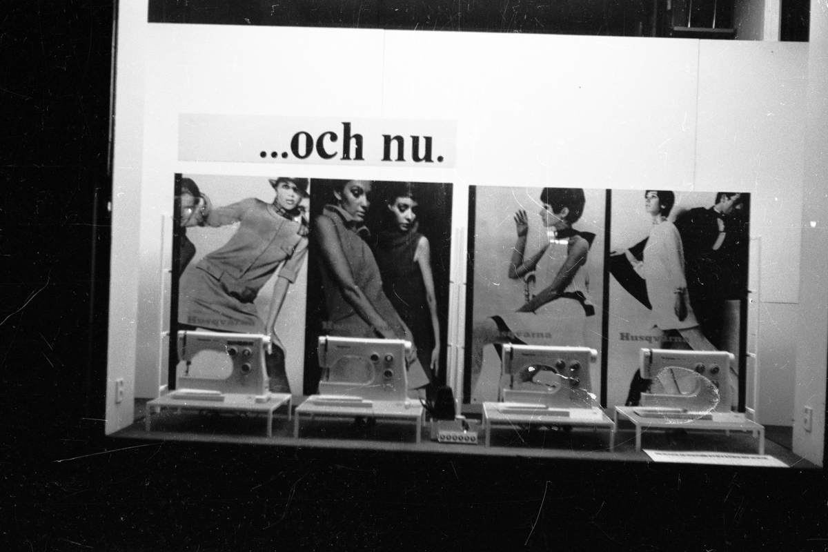 Ett skyltfönaster i Huskvarna med olika varianter på Husqvarna symaskiner och reklambilder på kvinnomodet i bakgrunden.