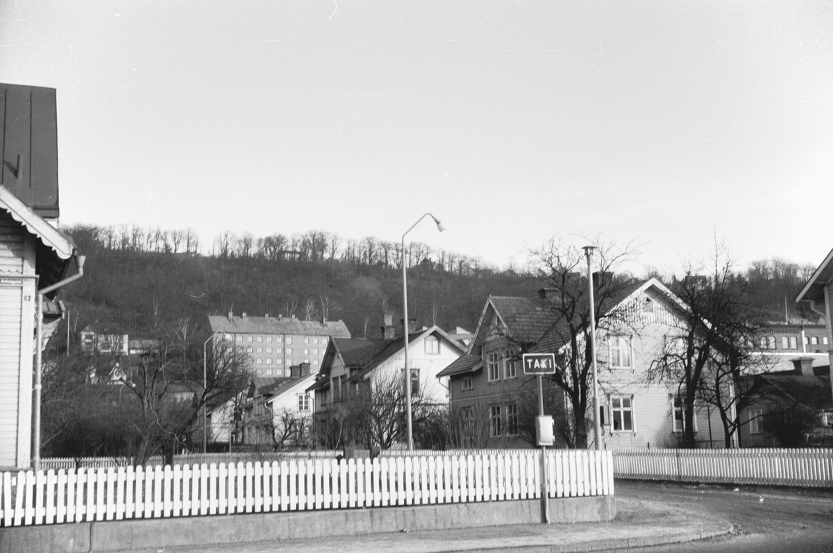 Bostadshus utmed Trädgårdsgatan i Huskvarna. I korsningen till Drottninggatan finns en TAXI-skylt.