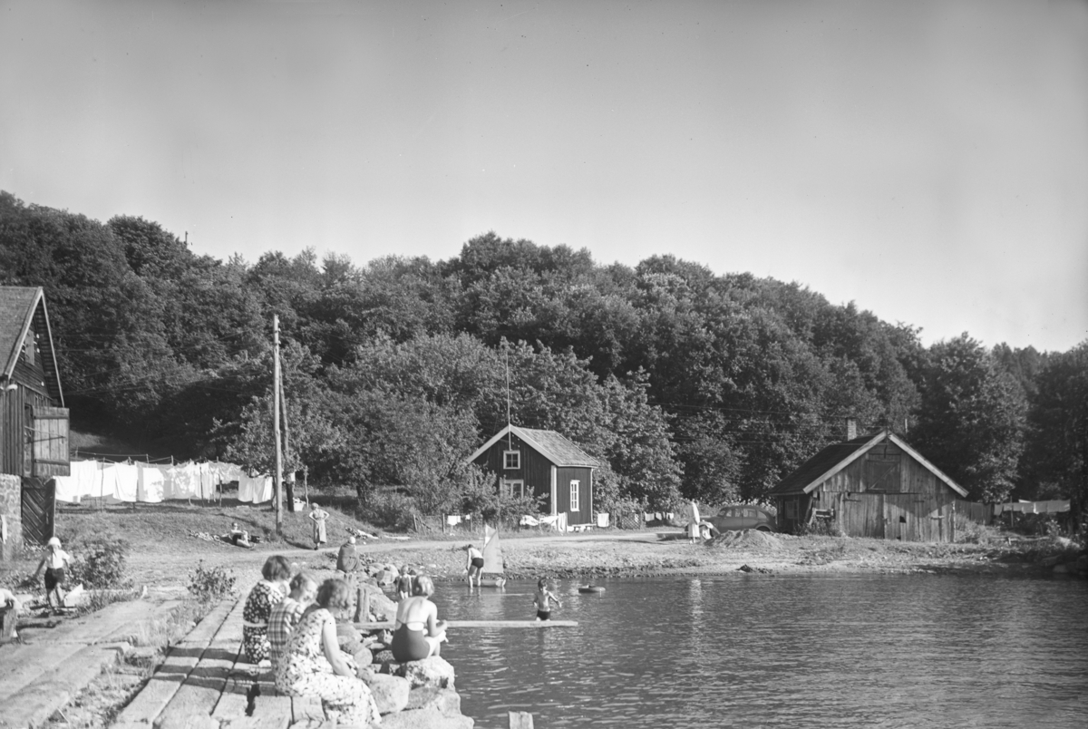 Röttle by strax söder om Gränna. På bryggan sitter några barn i sommarsolen. Till vänster hänger nytvättade lakan från Gyllene Uttern, ett hotell på berget ovanför Röttle.