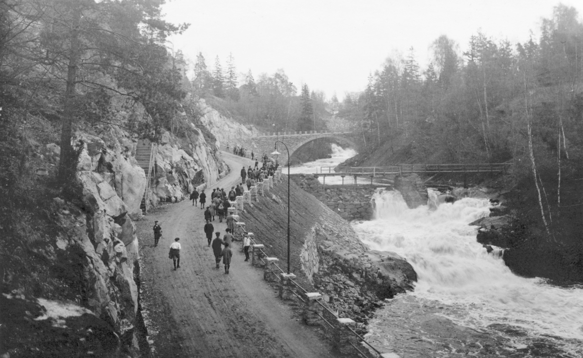 En grupp människor vandrar uppför Ådalsvägen i Huskvarna. Det mäktiga Huskvarnafallet forsar och dånar och några personer har stannat vid kanten och tittar.