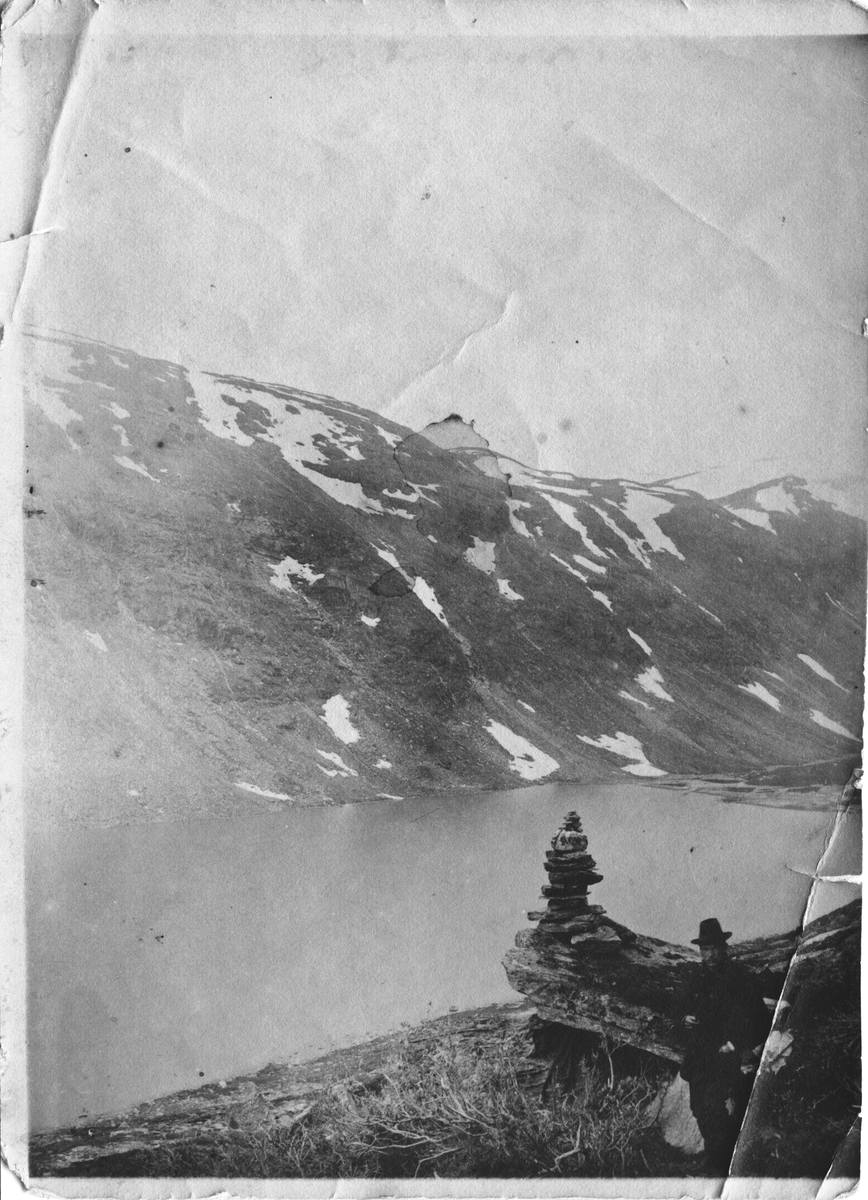 John Bauers Lapplandsresa sommaren 1904. En man står vid ett stenröse vid Kårsåjaure.