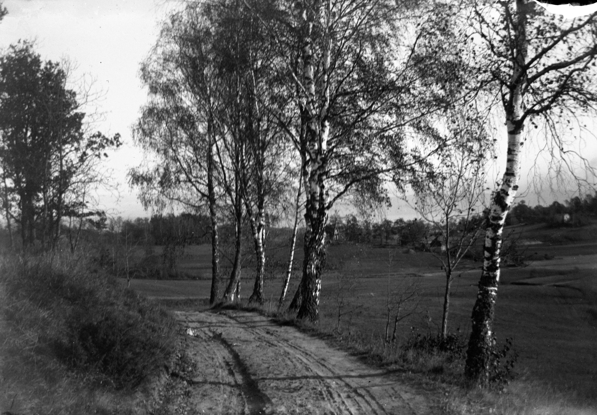 En grusväg svänger runt en kulle, kantad av björkar, i ett jordbrukslandskap.