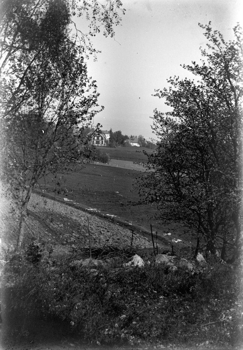 Mellan träden skymtar åkrarna som sträcker sig nerför sluttningen mot gården.