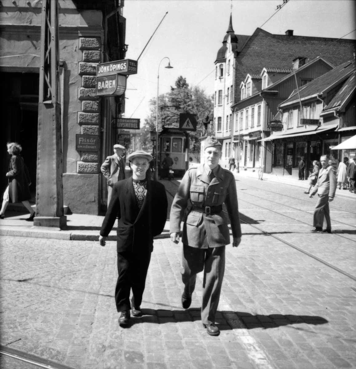 Två män i korsningen Barnarpsgatan/Västra Storgatan i Jönköping. Till vänster går Tore Damberg och till höger Stig Palm. Bakom dem ligger Jönköpingsbaren och Sörensens livsmedel.