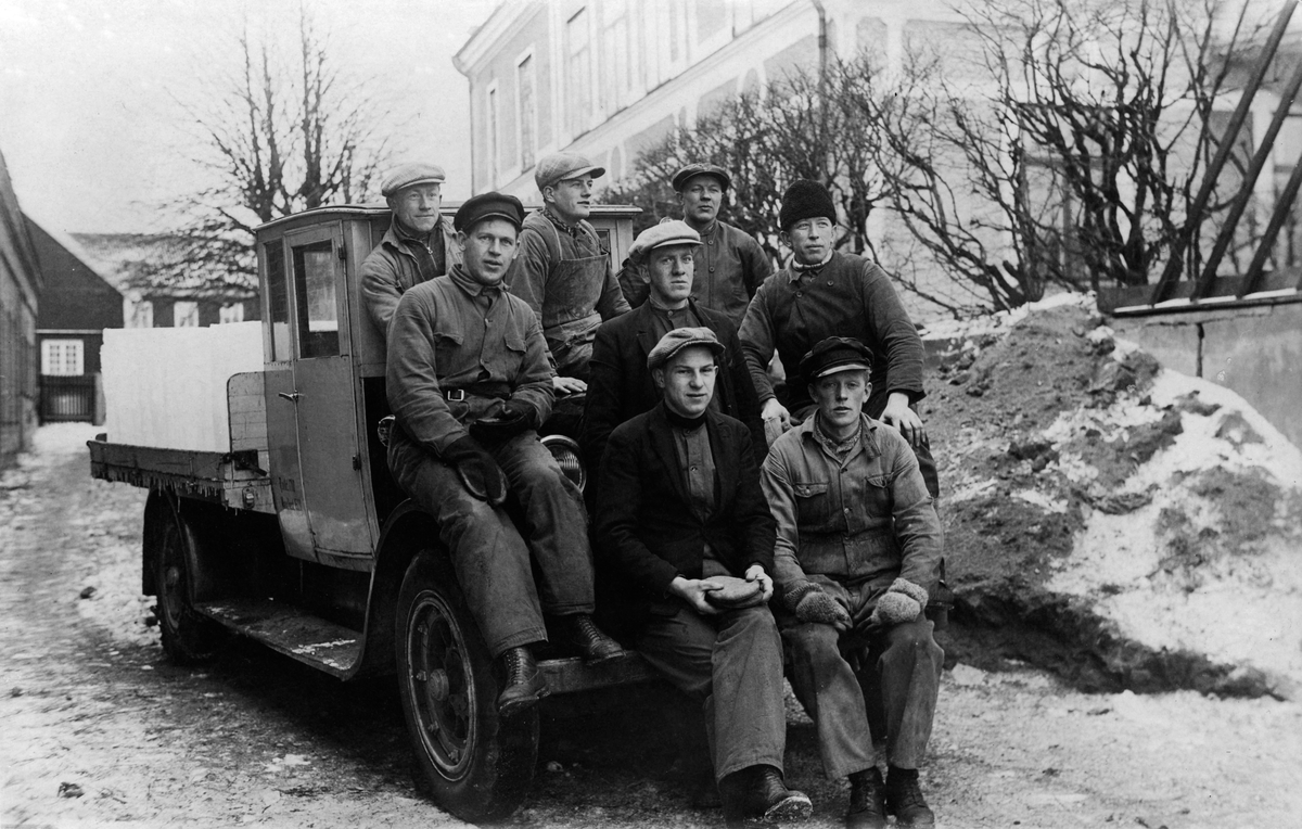Åtta män sitter på en liten lastbil, Krönleins eller Jönköpings bryggeris isbil.