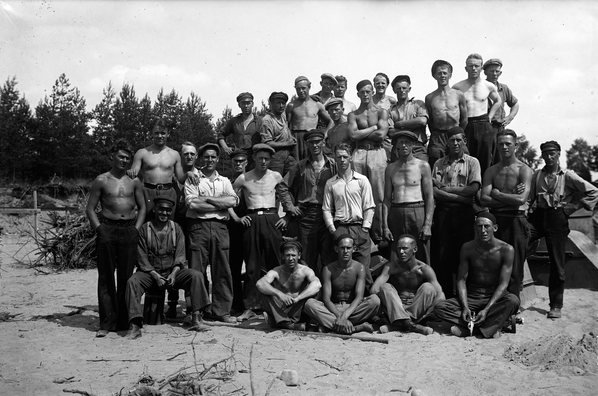 En grupp arbetare vid anläggandet av Jönköpings gamla flygfält. Flygfältet byggdes på de "bottenlösa" kärren sydväst om Rocksjön i början av 1930-talet.