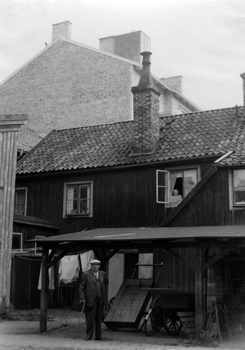 En bakgård i Jönköping med skjul, handkärror och tvätt på tork. En man med käpp står på kullerstensgården och en kvinna tittar ut genom ett fönster.