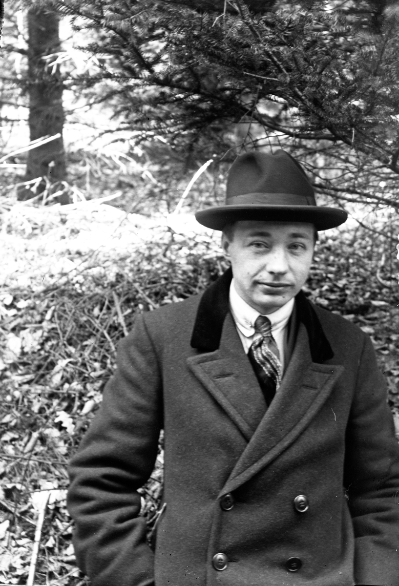 Porträtt av fotograf Gustav Andersson från Jönköping, i bakgrunden skog.