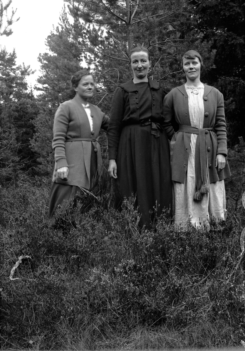 Tre kvinnor har stannat till på skogspromenaden för fotografering. Fotografens anmärkning: Gruppbild kärringar.