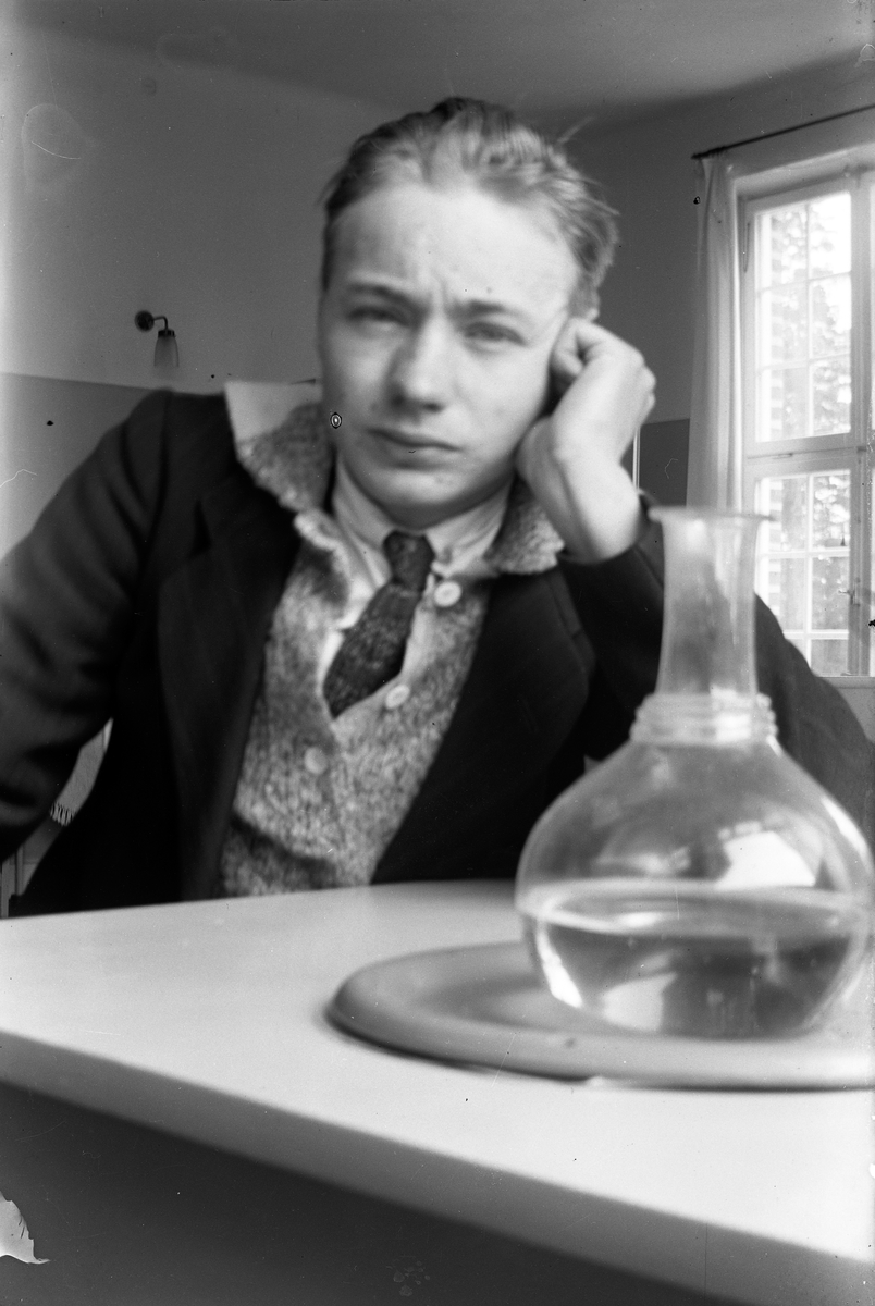 Gustav Andersson stödjer armbågen mot en bordskiva, där det står en vattenkaraff, i ett rum på Lungkliniken i Eksjö.