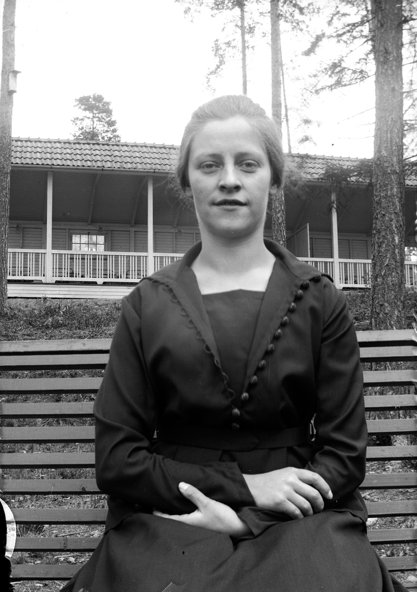 En kvinna, Ebba Berg, sitter på en bänk med en träveranda i bakgrunden, vid lungkliniken i Eksjö. Fotografens anm: Ebba Berg, Bröst.
