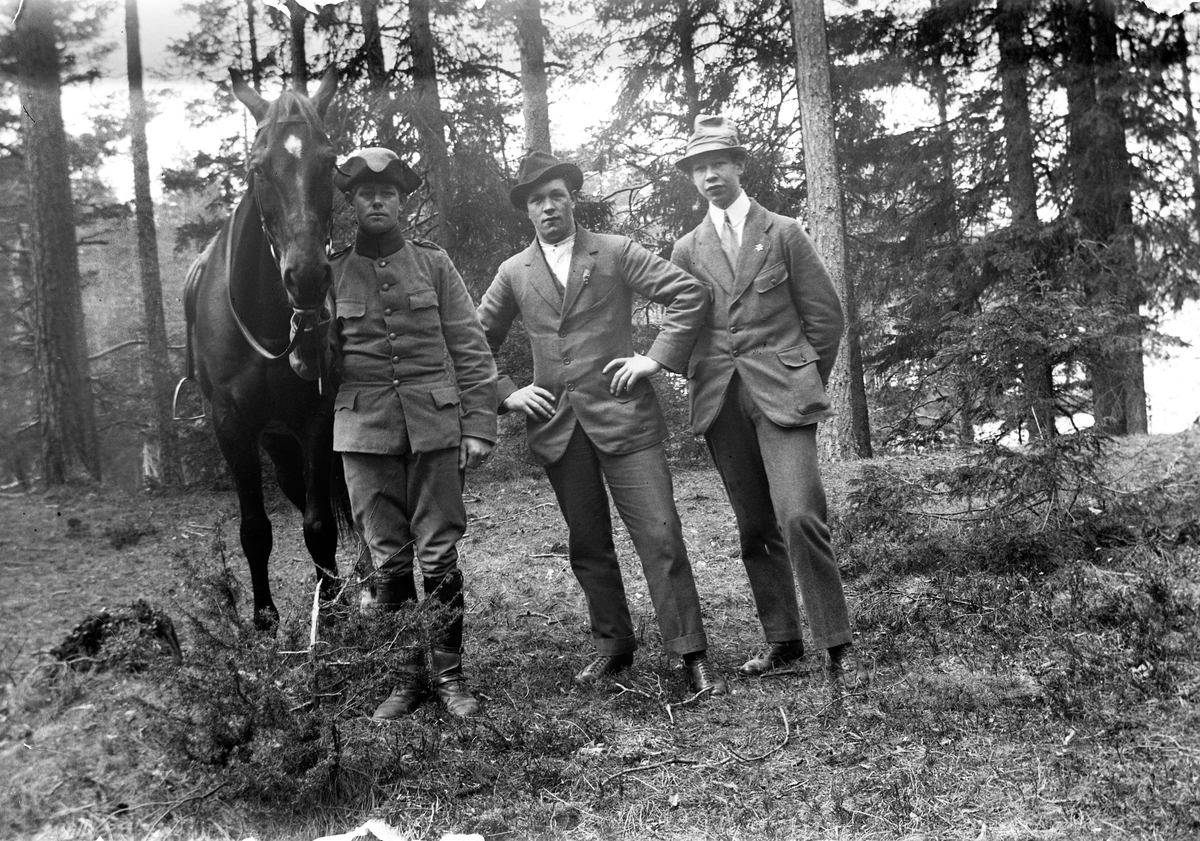 Tre män varav en i soldatuniform, samt en ridhäst i barrskogen.