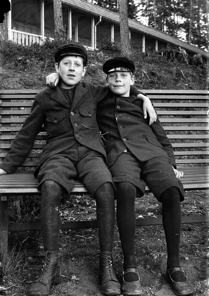 Två pojkar sitter på en bänk med en träveranda i bakgrunden vid Lungkliniken i Eksjö. Fotografens anmärkning "Mellberg och Franzen" .