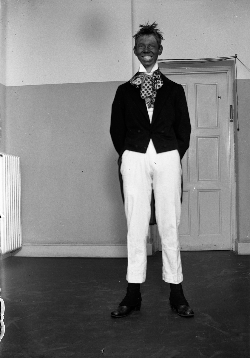 En man svärtad i ansiktet och utklädd i bland annat prickig kravatt.