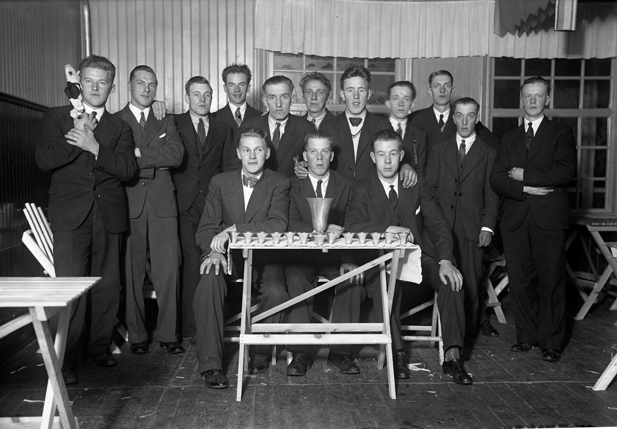 En idrottsförening i Jönköping. På bordet i mitten är vunna pokaler uppställda och mannen till vänster håller i maskoten.