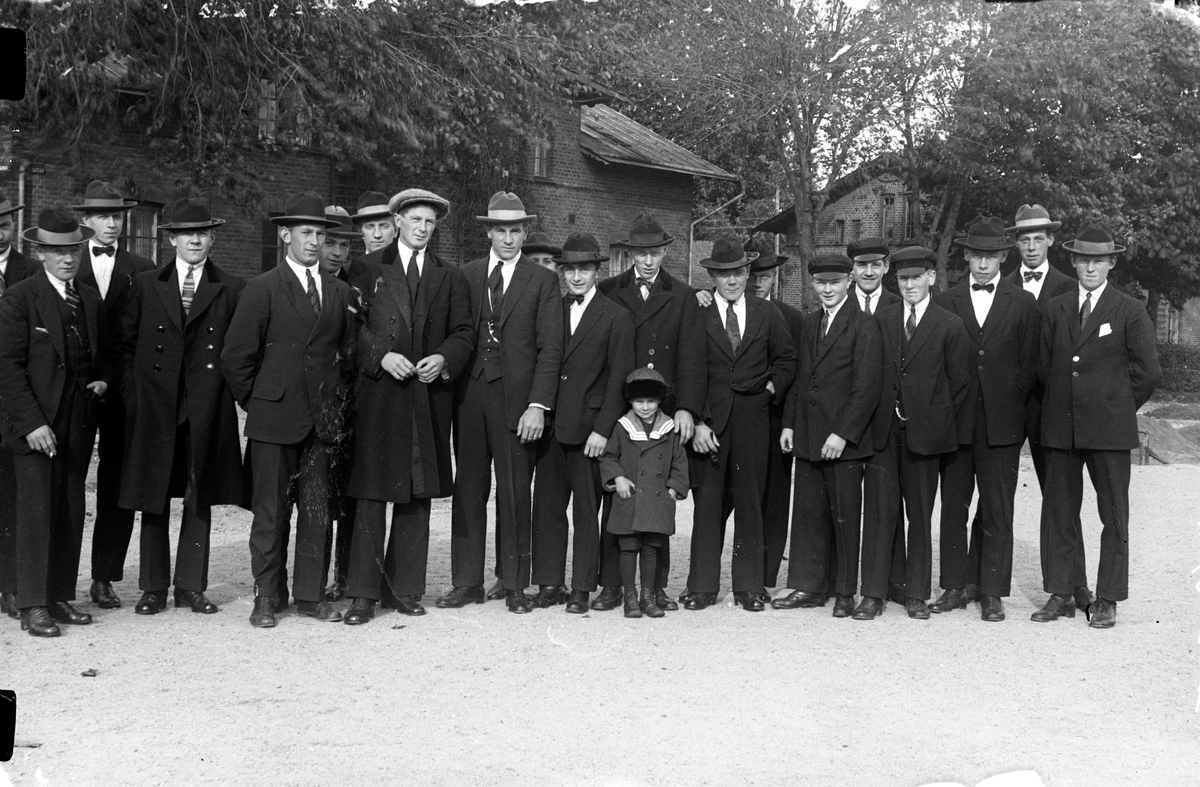 Tjugo män samt en liten pojke, i bakgrunden syns två tegelhus i kvarter Jägmästaren, Jönköping.