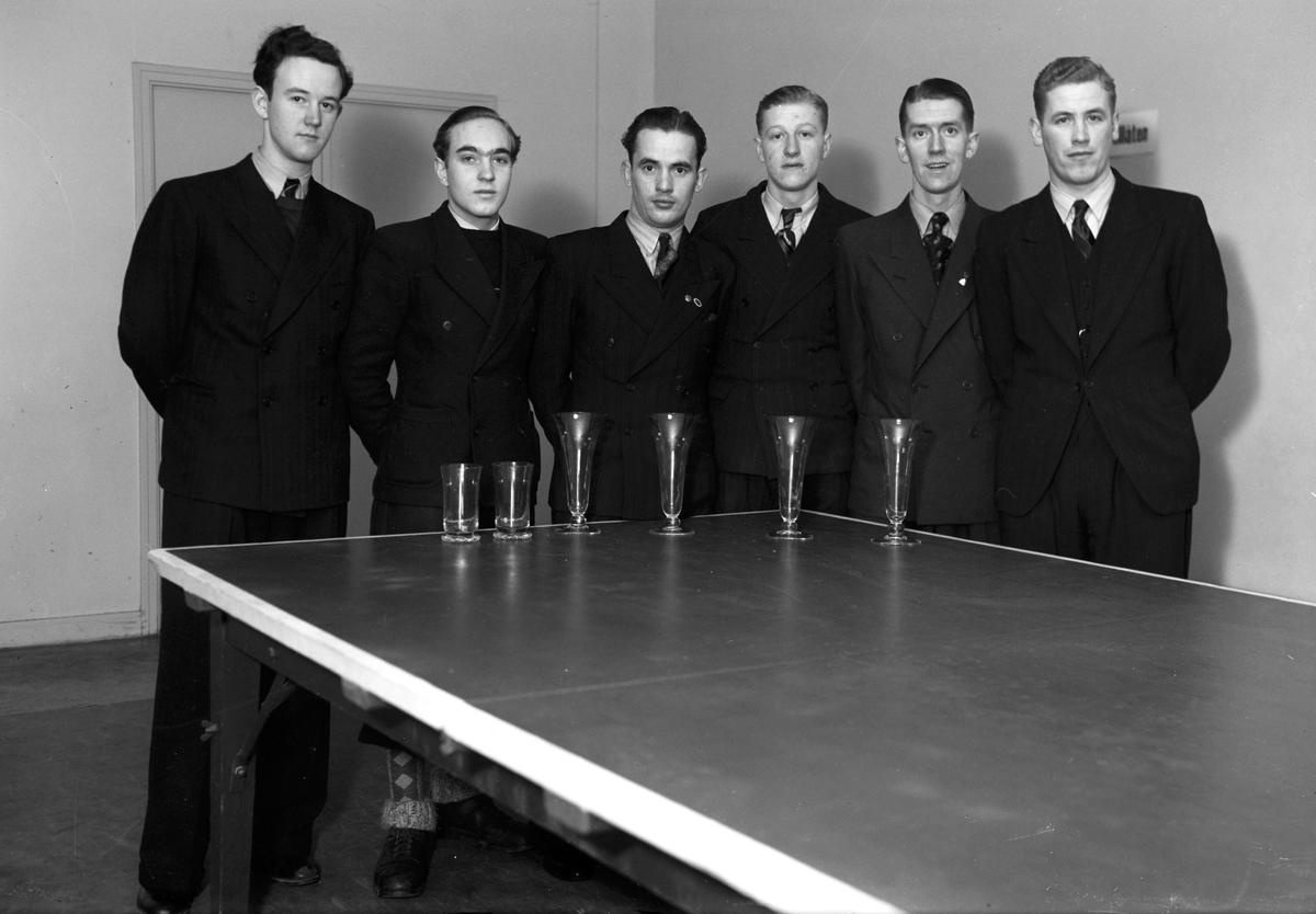 Gruppbild på medlemmar i en idrottsförening i Jönköping. Pokalerna är uppställda på bordet framför dem.