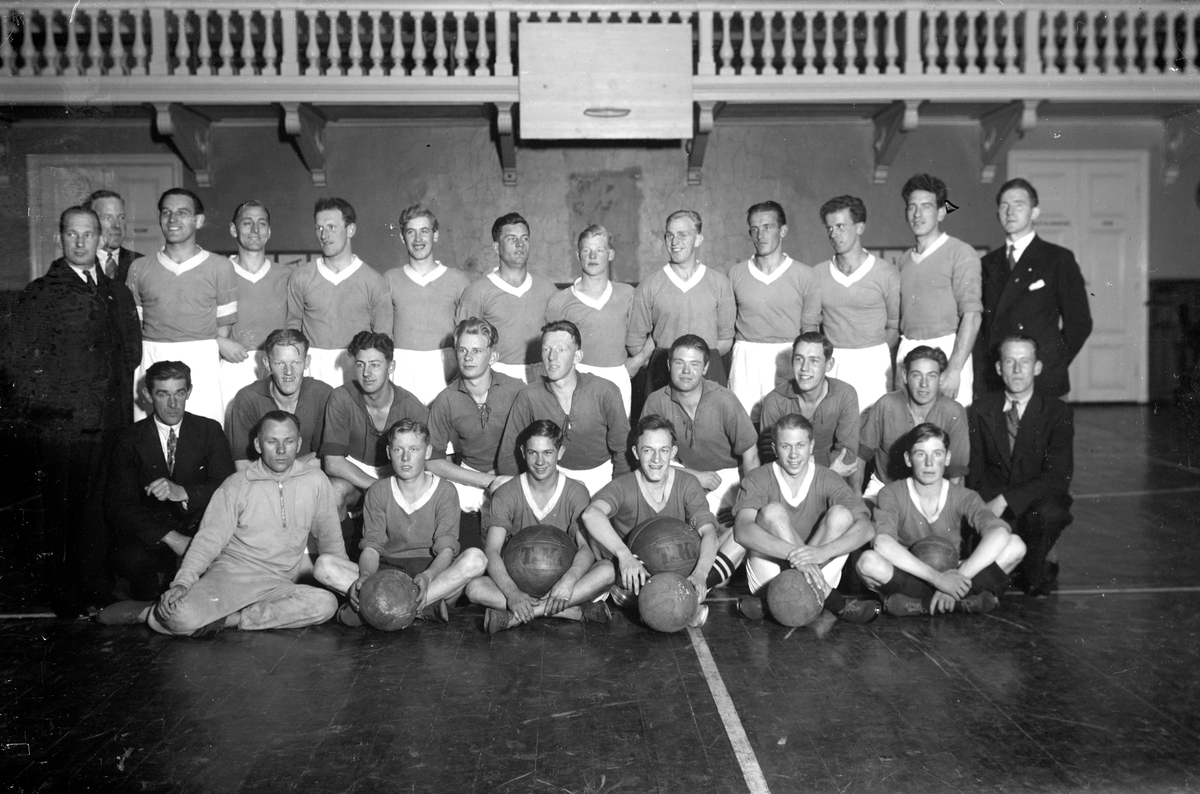 Gruppbild på medlemmar i idrottsföreningen IK Tord, troligen läroverkets idrottslokal år 1934,Jönköping.