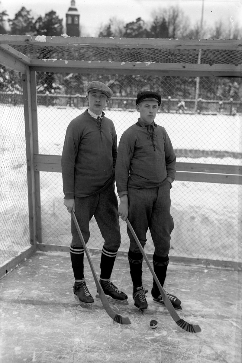 Två bandyspelare på Stadsparksvallen i Jönköping. Nils Damgren till höger, IK Tord-profil och god vän till fotograv Gustav.