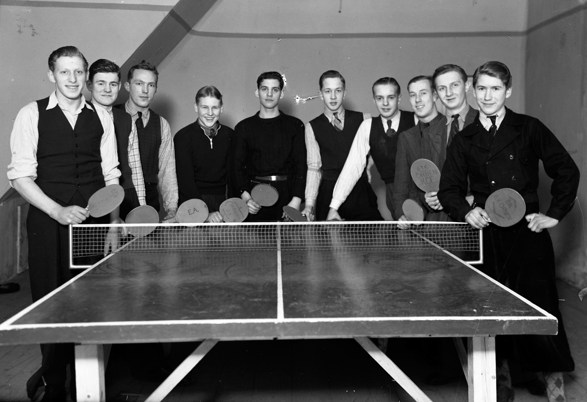 Gruppbild på medlemmar i BK Örnen runt ett pingisbord i Jönköping.