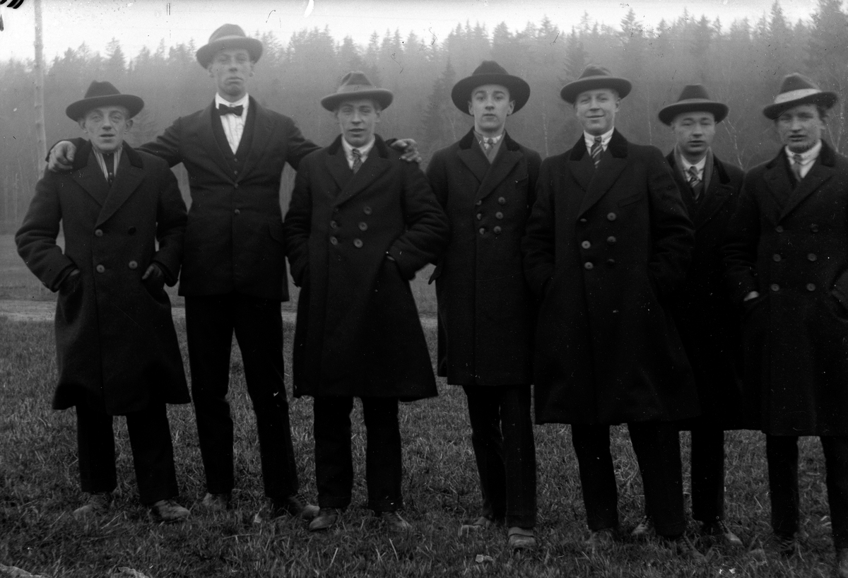 Sju män, från vänster Filip Larsson (2), Gustav Andersson (6) står uppställda framför en väg med skog bakom.