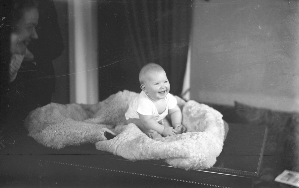 Porträtt av ett litet barn som sitter på en skinnfäll på ett bord.