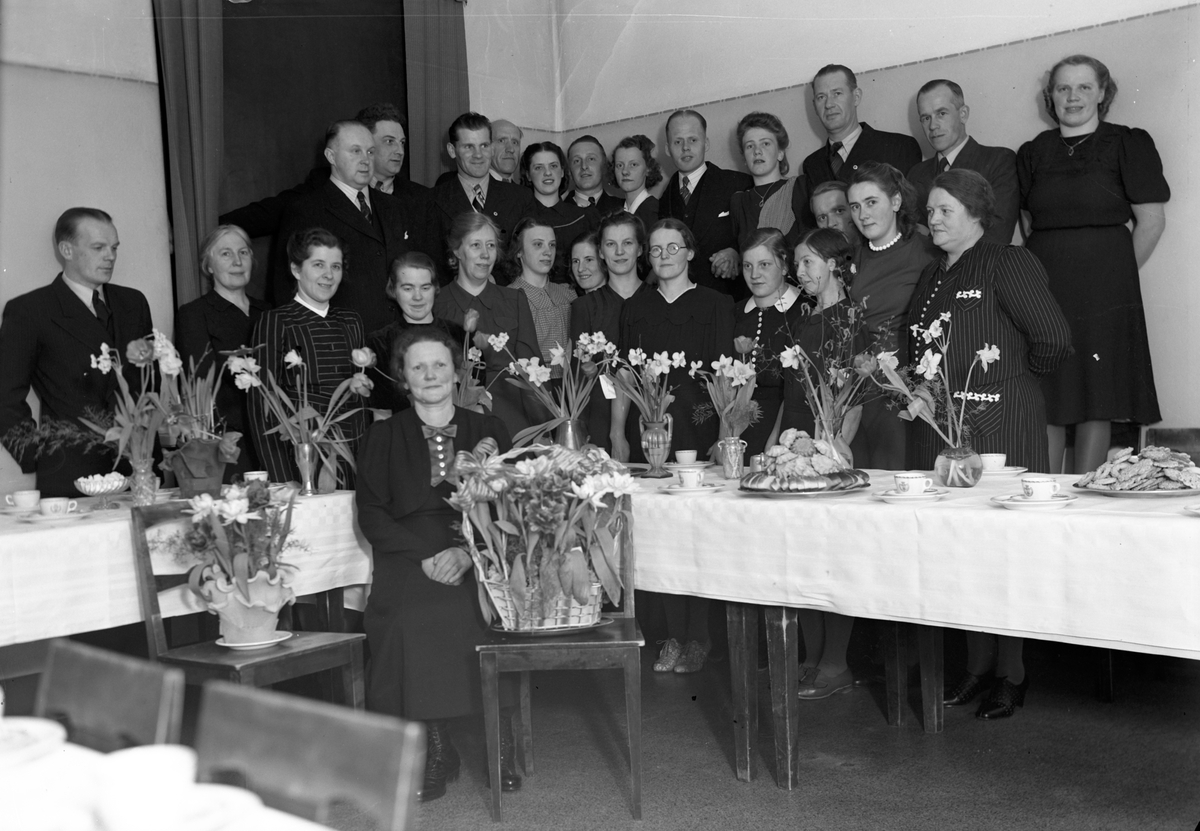 Högtidsdagen firas med gäster och dukat kaffebord. Blommor och lyckönskningar är arrangerade runt omkring.