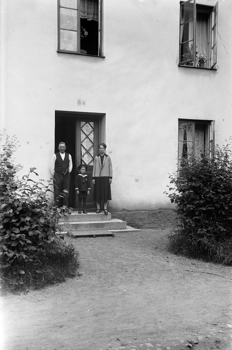En man, en kvinna och en pojke står i dörröppningen till Tändsticksbolagets hus vid Västra torget i Jönköping. Lägenheterna omfattade ett rum och kök, men var ändå mycket eftertraktade.