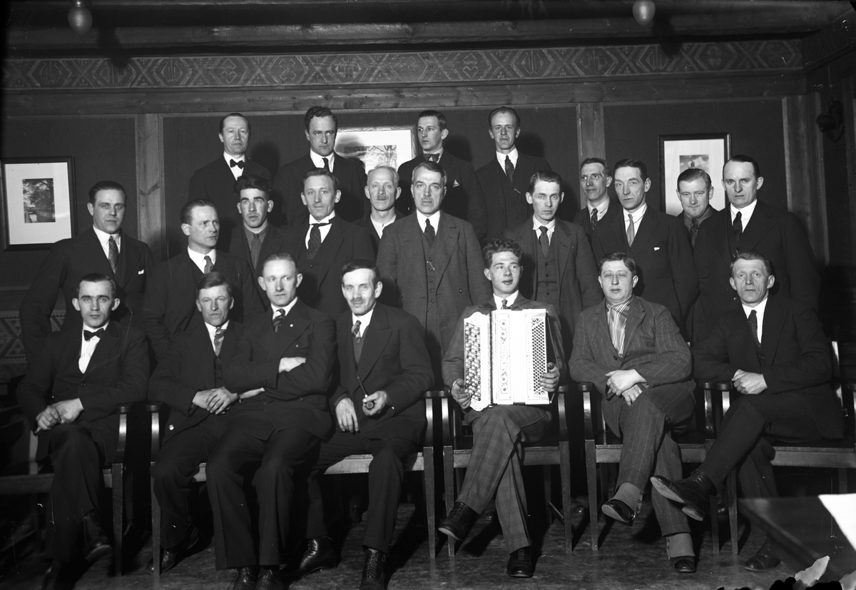 En grupp män, en med dragspel i knät, är församlade i en lokal.