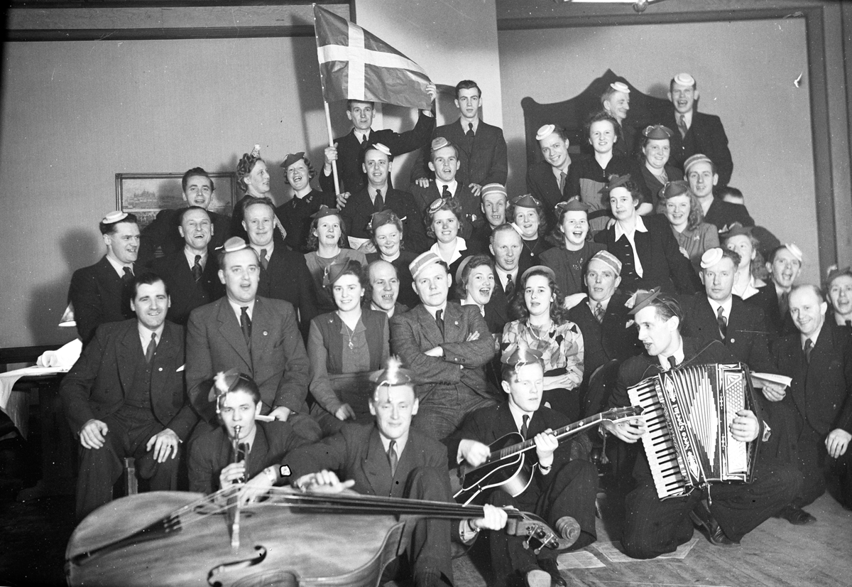 En gruppbild på festklädda män och kvinnor i en samlingslokal.