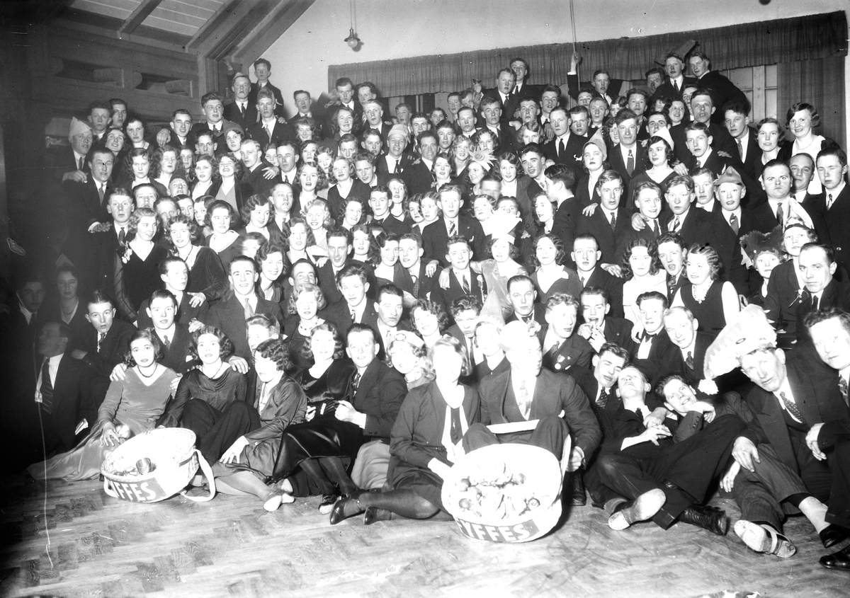 En gruppbild på festklädda män och kvinnor i en samlingslokal.