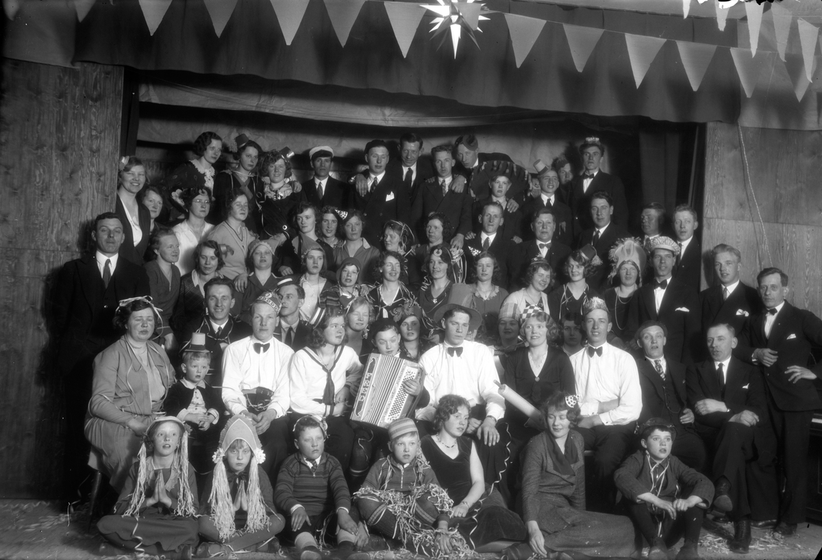 Festklädda människor poserar på scenen.