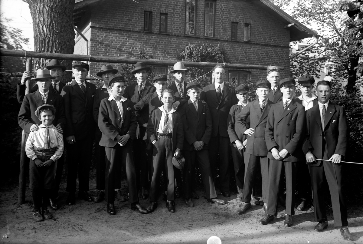 Gruppbild på unga män och pojkar framför ett tegelhus.