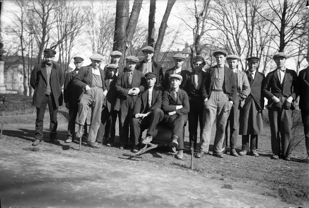 En samling män, kanske parkarbetare. Två av dem sitter på en vält.
