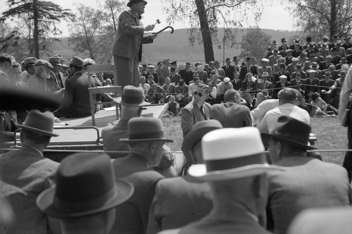 Djurauktion. Auktionsförrättaren står på en vagn med klubba och käpp i handen.