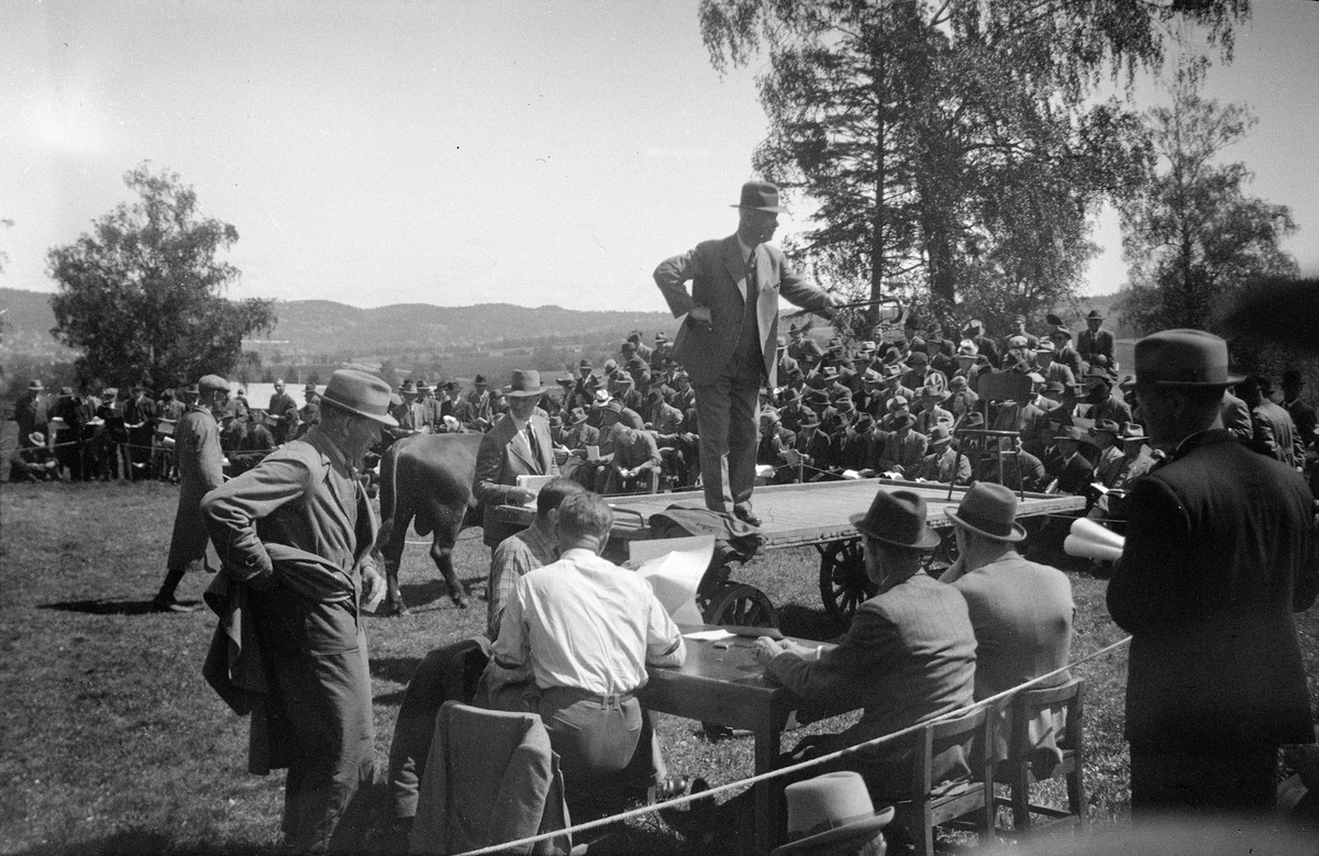 Djurauktion. Auktionsförrättaren står på en vagn med klubba och käpp i handen. Bakom honom leder en man en ko.