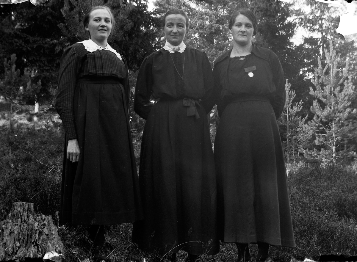 Tre kvinnor i mörka klänningar, står i barrskogen vid Lungkliniken i Eksjö.