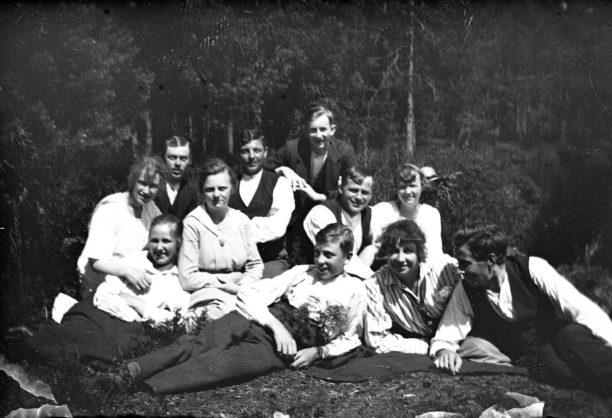 Sex unga män och fem unga kvinnor sitter eller halvligger i barrskogen vid Lungkliniken i Eksjö.