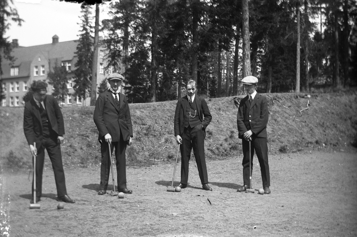 Fyra män spelar krocket, Gustav Andersson (3), vid Lungkliniken i Eksjö. I bakgrunden syns huvudbyggnaden.