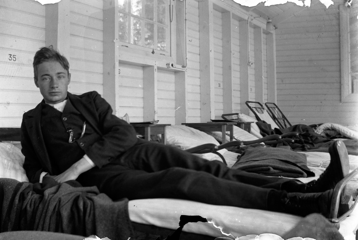 Gustav Andersson ligger på en säng på träverandan, i bakgrunden syns tomma sängar. Fotografens anmärkning " Habf " Andersson". Lungkliniken, Eksjö.
