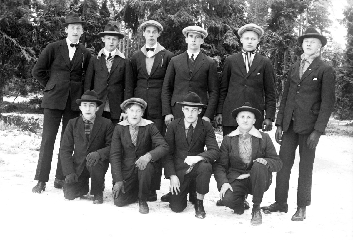 Tio män, sex står och fyra knäböjer framför, på en plats i skogen.