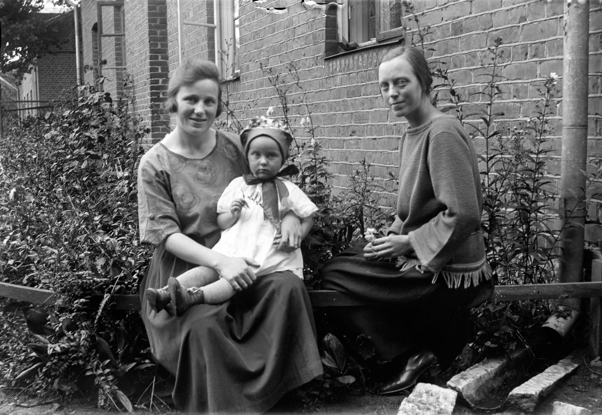 Två kvinnor, den ena med en liten flicka i knät, sitter på ett träräcke framför ett bostadshus med plantering runt.