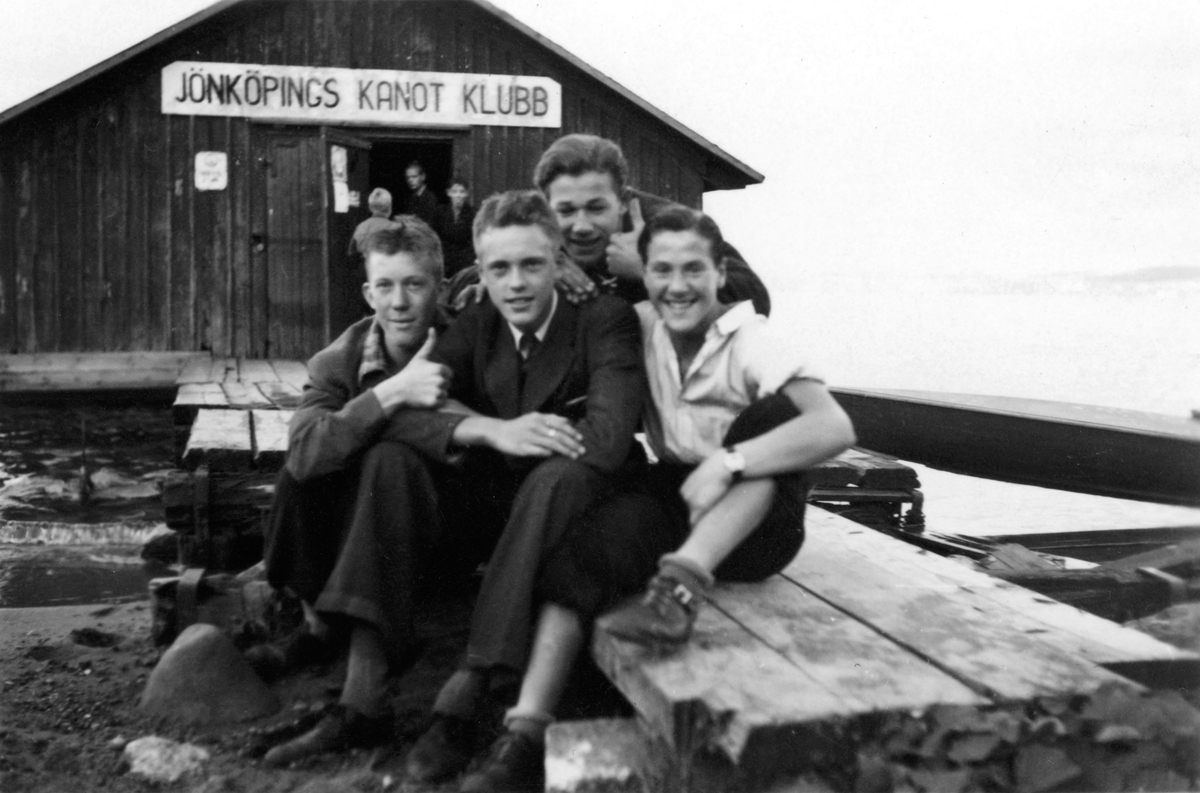 Fyra ungdomar framför huset med skylten "Jönköpings kanot klubb".