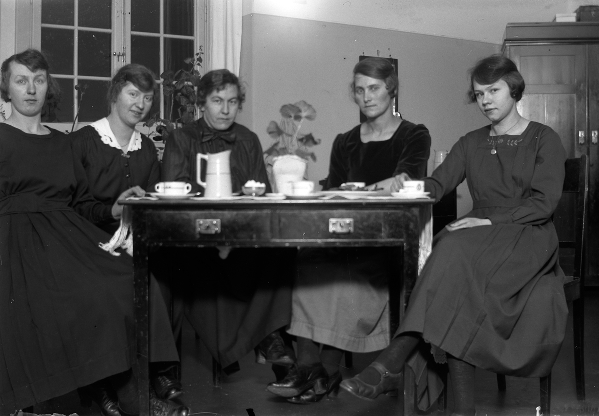 Lungkliniken i Eksjö. Fem kvinnor sitter runt ett bord och fikar. I bakgrunden syns ett fönster och ett skåp.